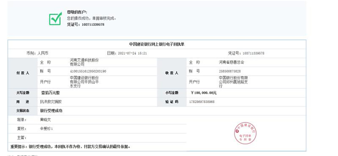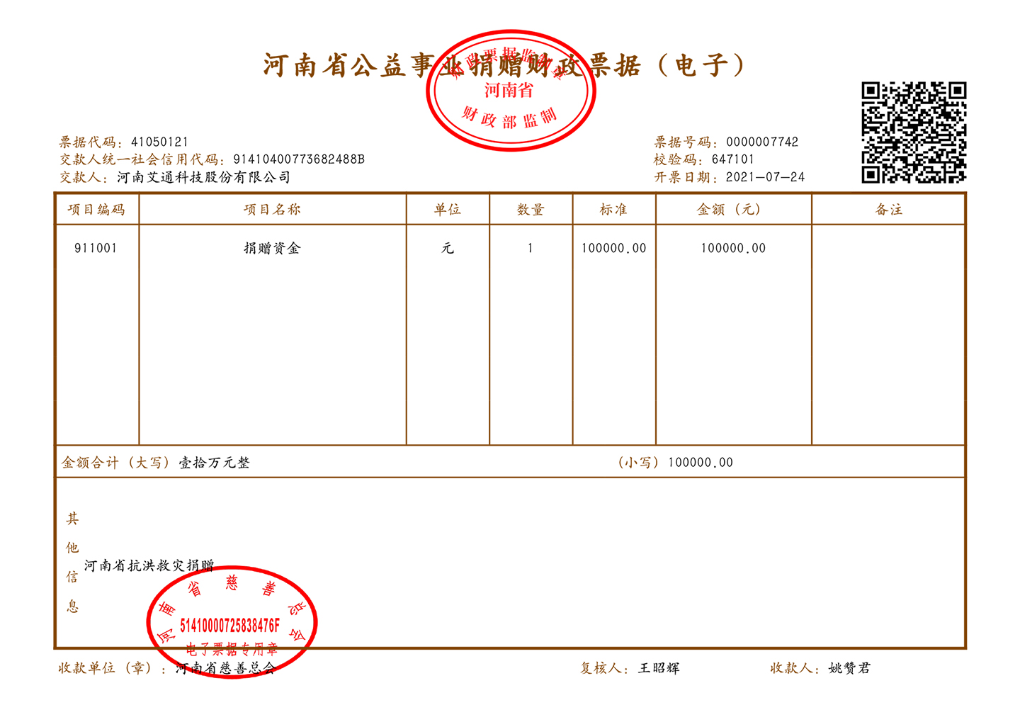 自7月17號以來,河南多地普降暴雨,鄭州等城市發(fā)生嚴(yán)重的內(nèi)澇,造成人員傷亡和財產(chǎn)損失,嚴(yán)重的汛情牽動著河南艾通科技股份有限公司全體員工的心,洪澇無情,人間有愛,在大災(zāi)大難面前,艾通人情系災(zāi)區(qū),捐獻“艾心”。