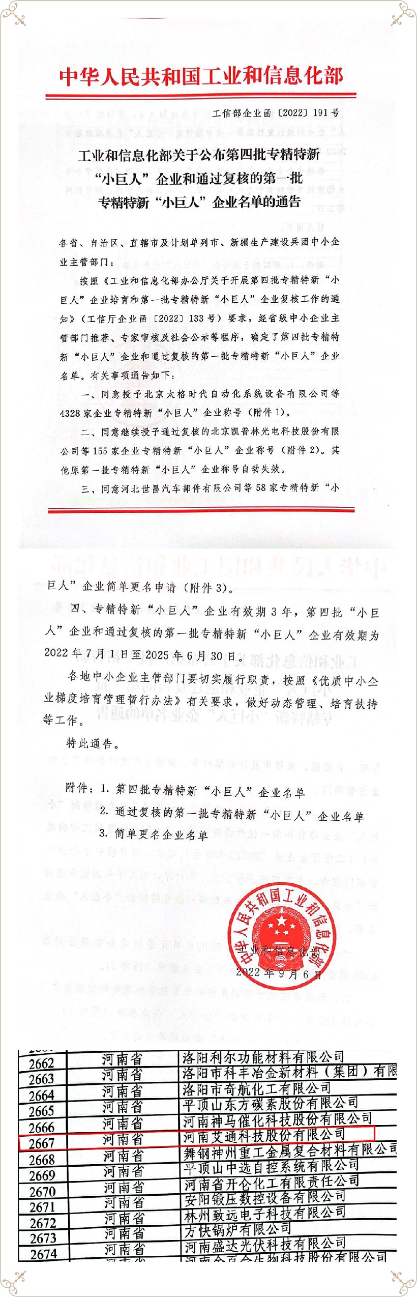 近日,工信部公布了全國第四批專精特新“小巨人”企業(yè)名單,河南艾通科技股份有限公司憑借在能源綜采裝備制造領(lǐng)域的卓越表現(xiàn),成功入選國家級專精特新“小巨人”企業(yè),這標志著艾通公司的發(fā)展再上了新的臺階。